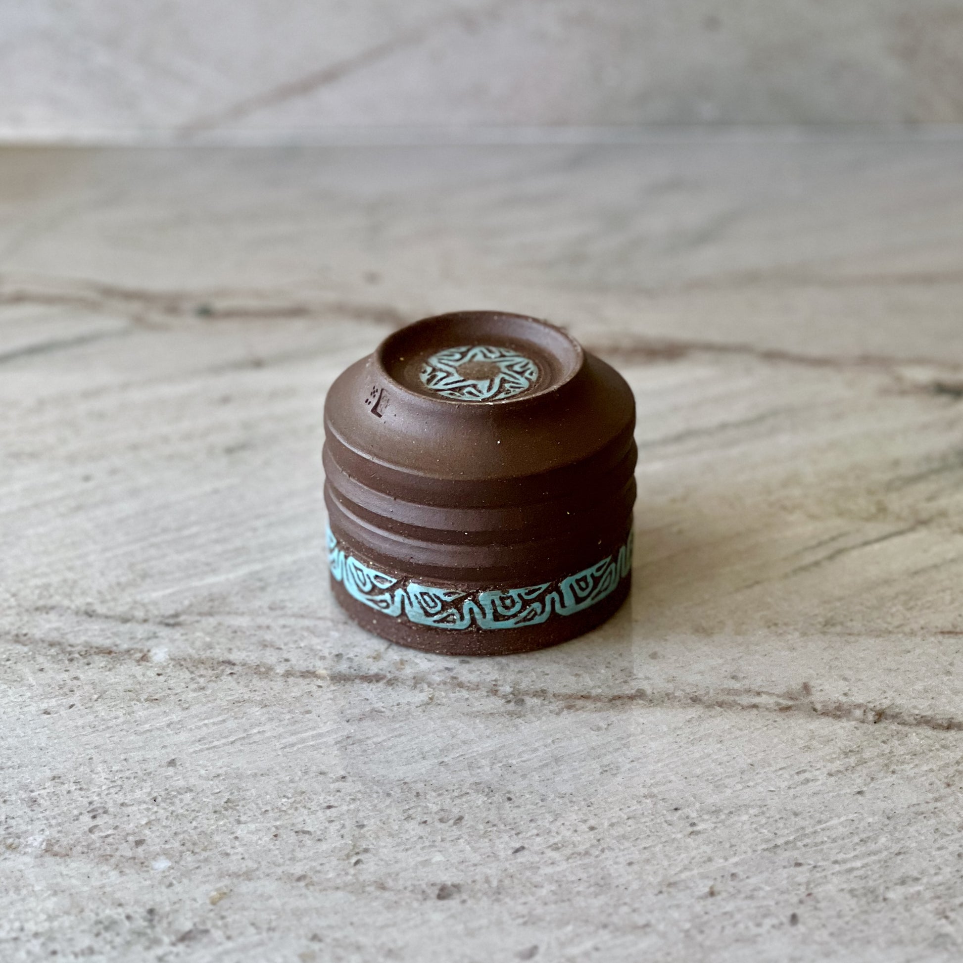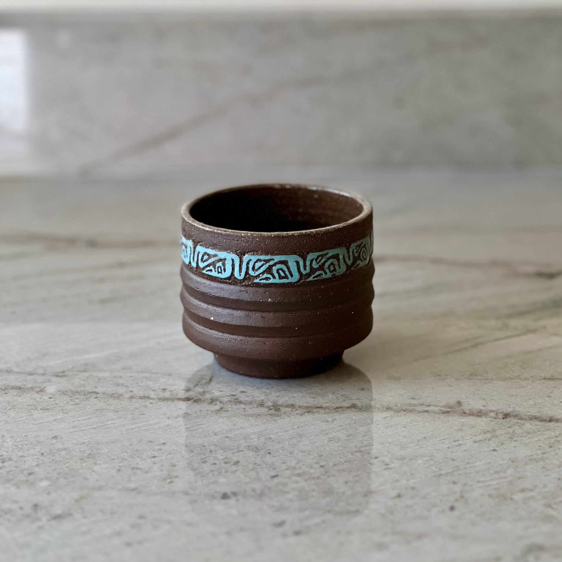 This smaller tumbler has an angular ribbed side shape, and thin blue slip detail making it look ancient and modern at the same time. Perfect for your collection as long as it gets used.