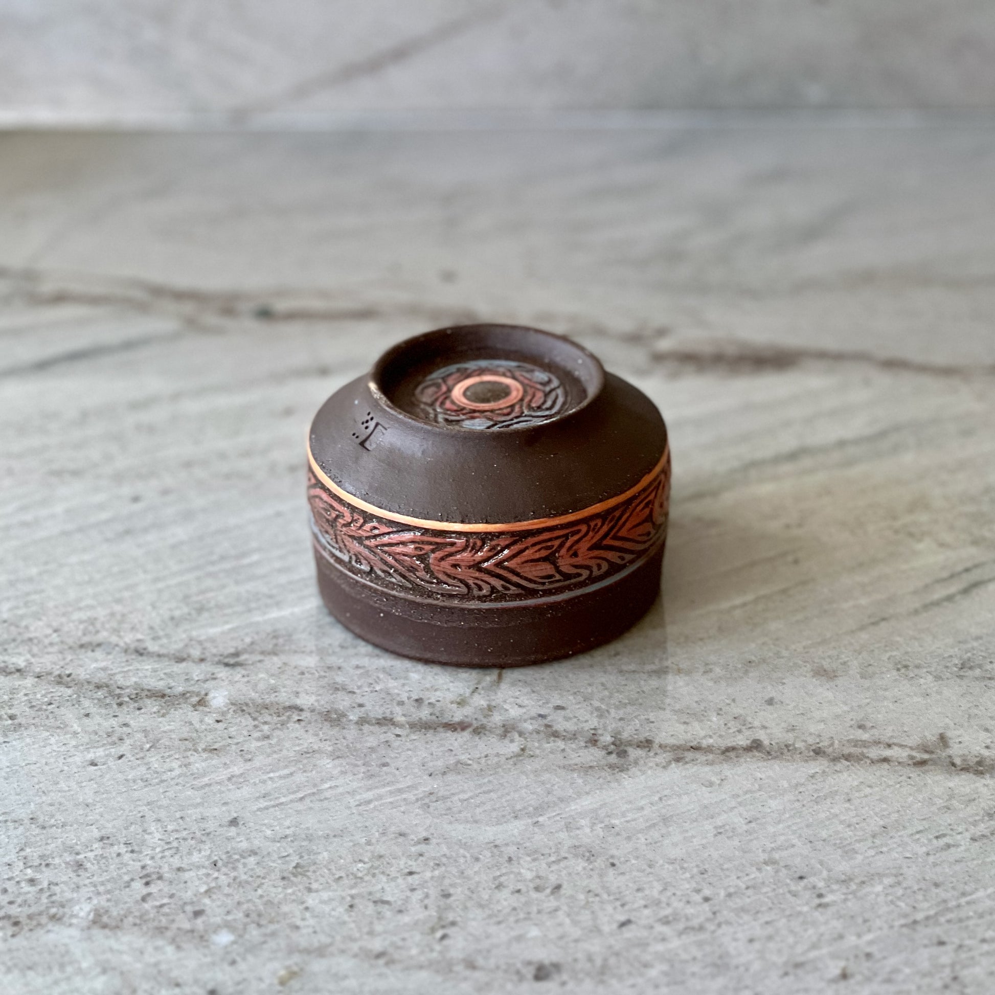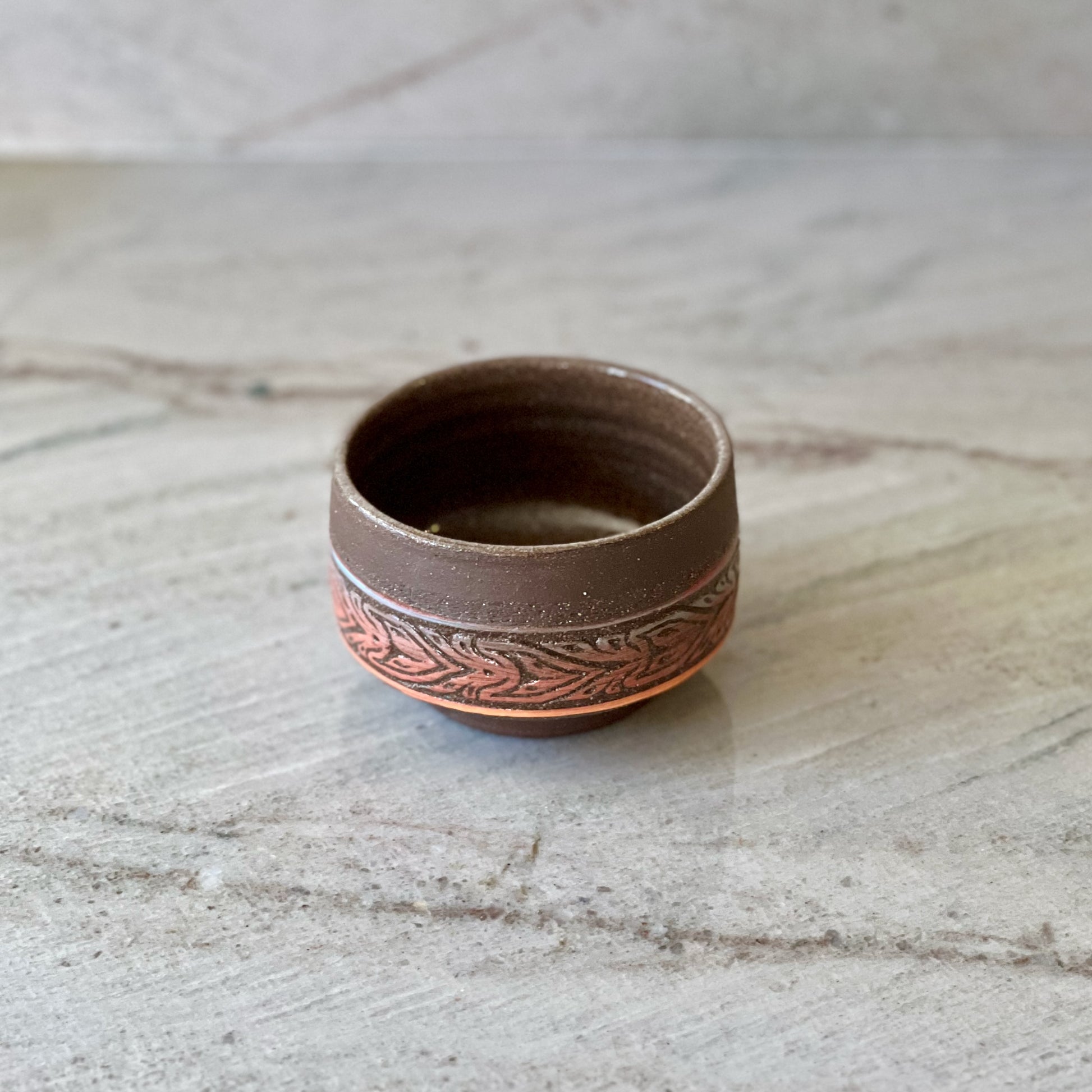 This is a shorter, modern shaped tumbler with a mostly red (and hint of blue) carving detail around the outside. Perfect for that single ice cube drink, or a late night frozen snack.