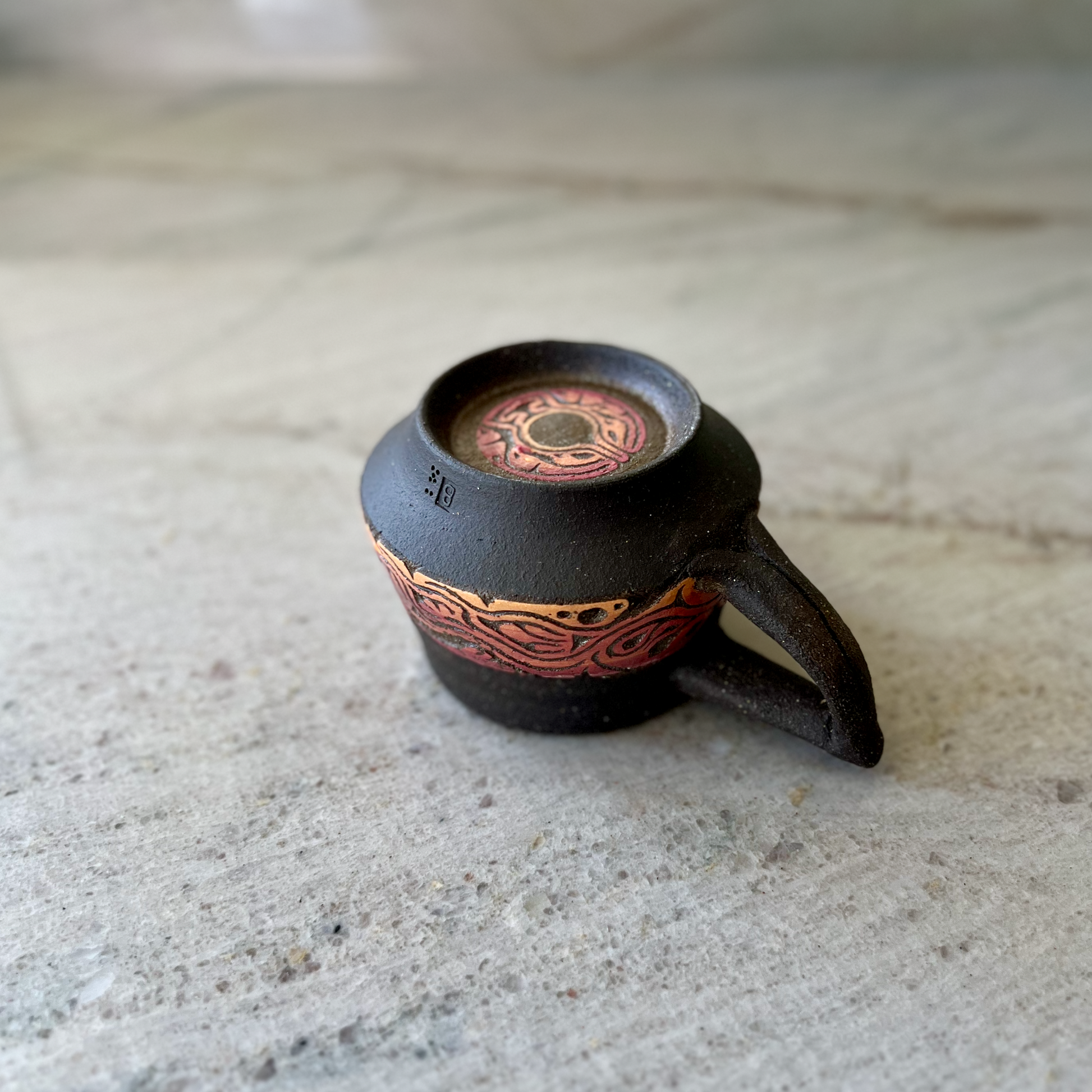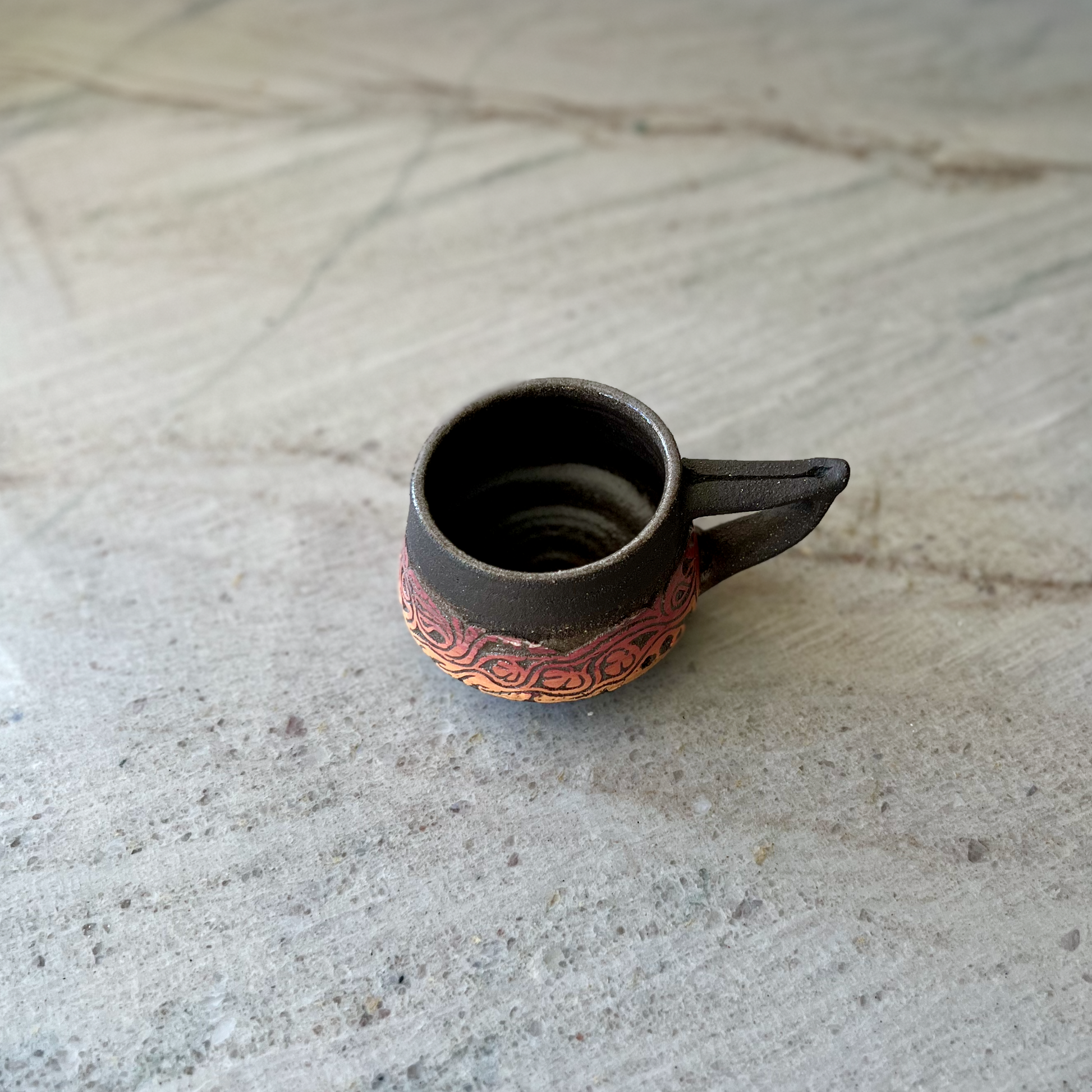 Charcoal Cup with Handle and Red Orange Carving