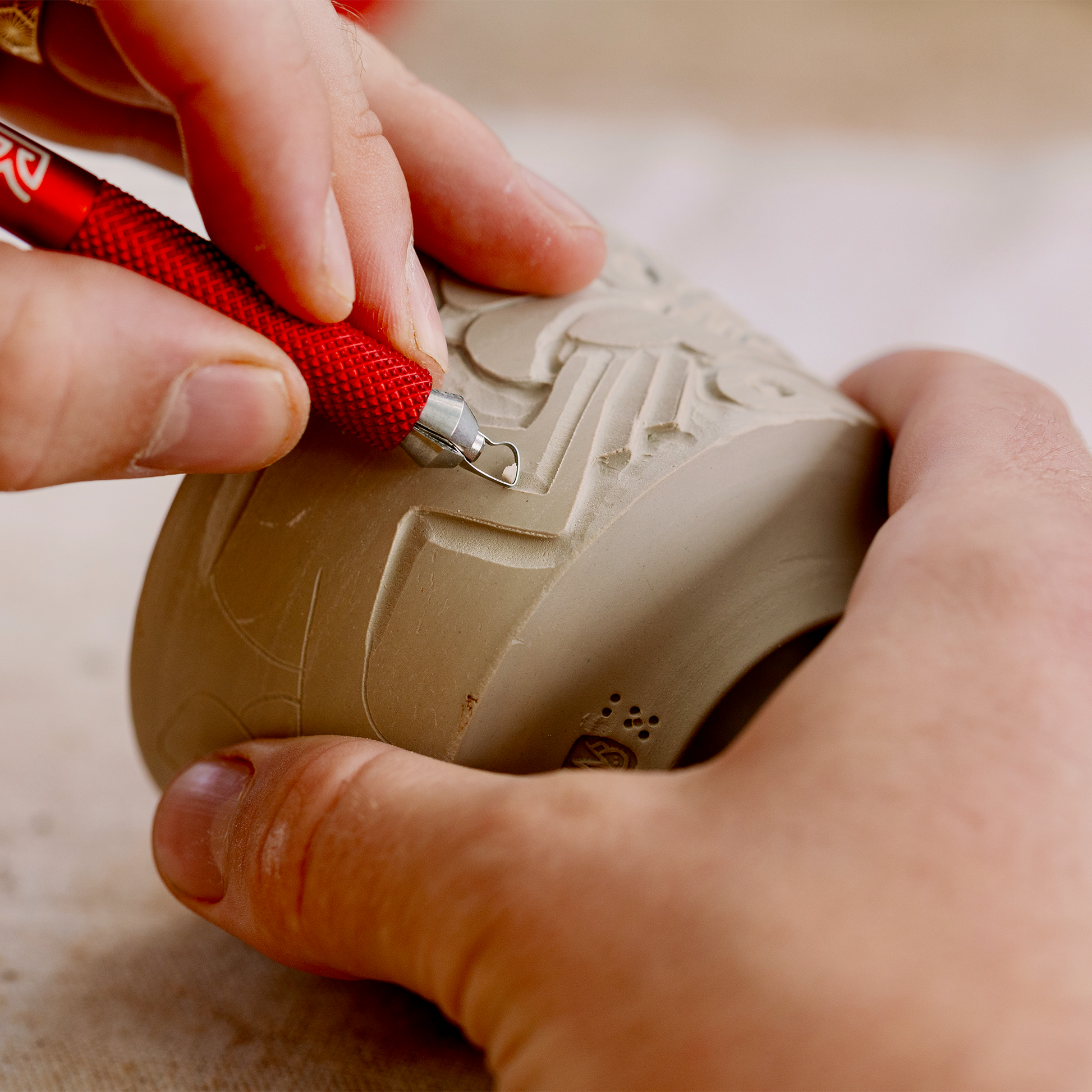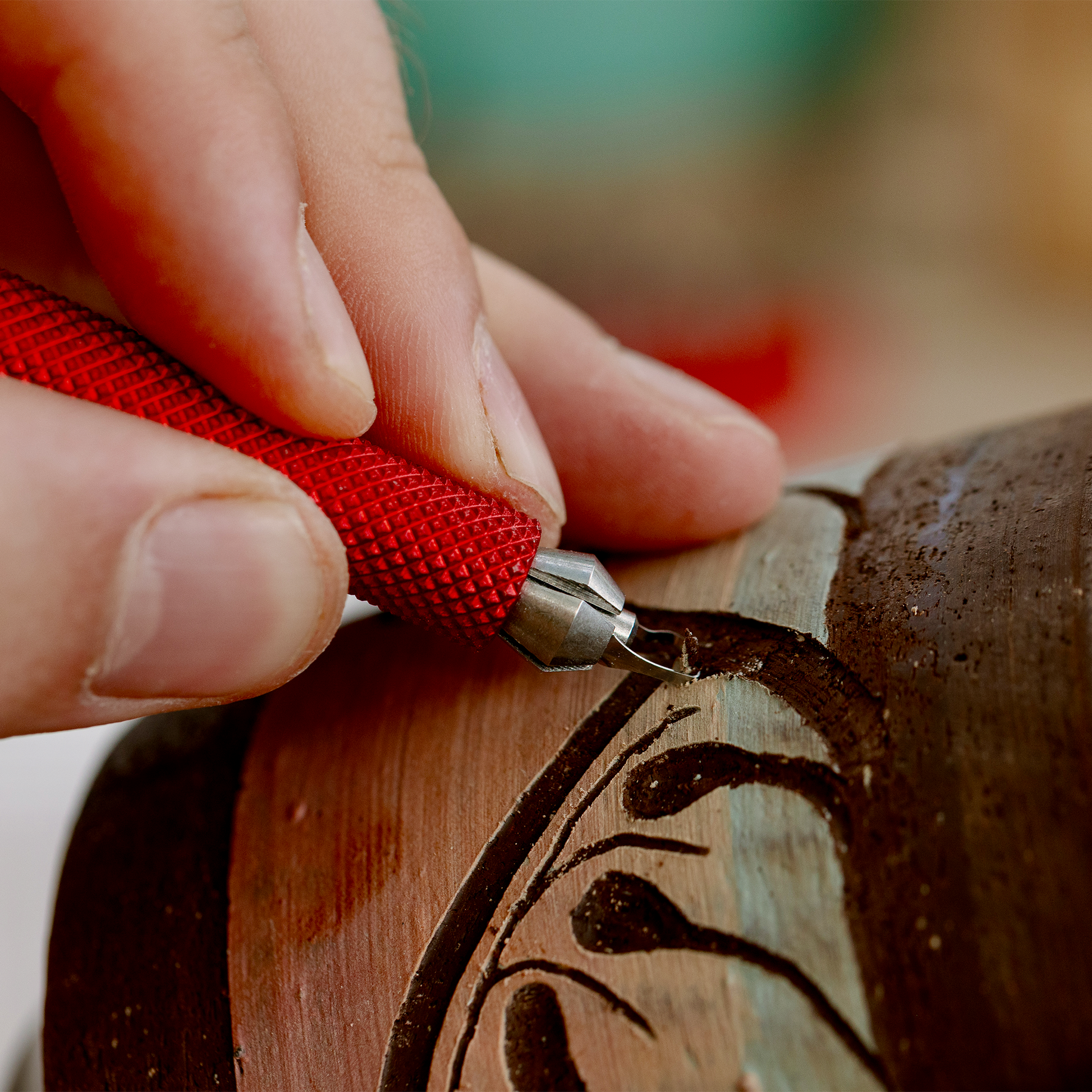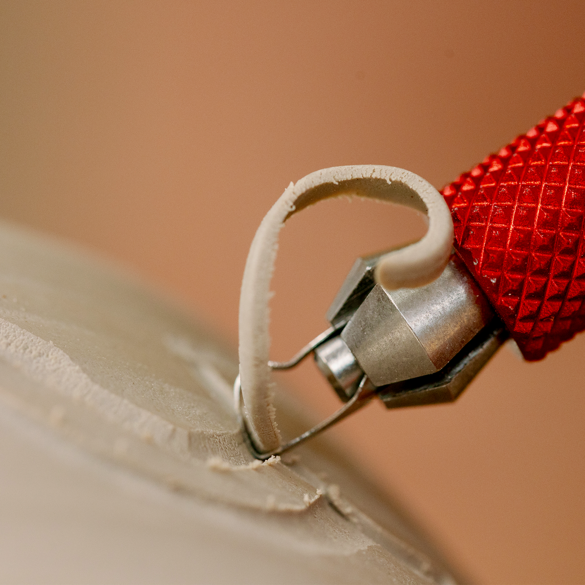 The medium P-shaped blade is unique and highly versatile for both sgraffito and relief carving. It can be used in many of the same ways as a chisel blade, but its flatter top allows for even more feathered, tapered grooves and smoother, wider surface removal depending on the area you’re working on.