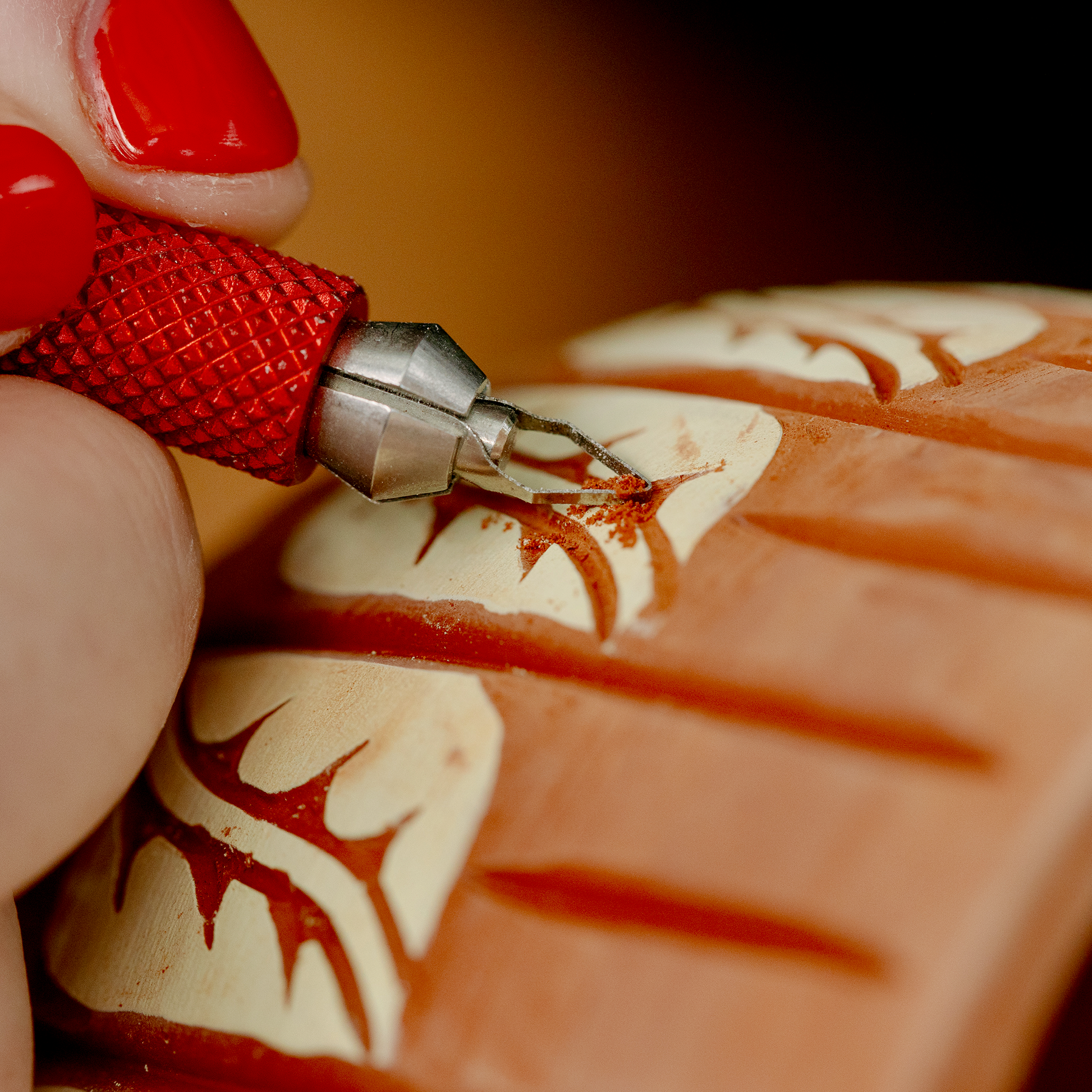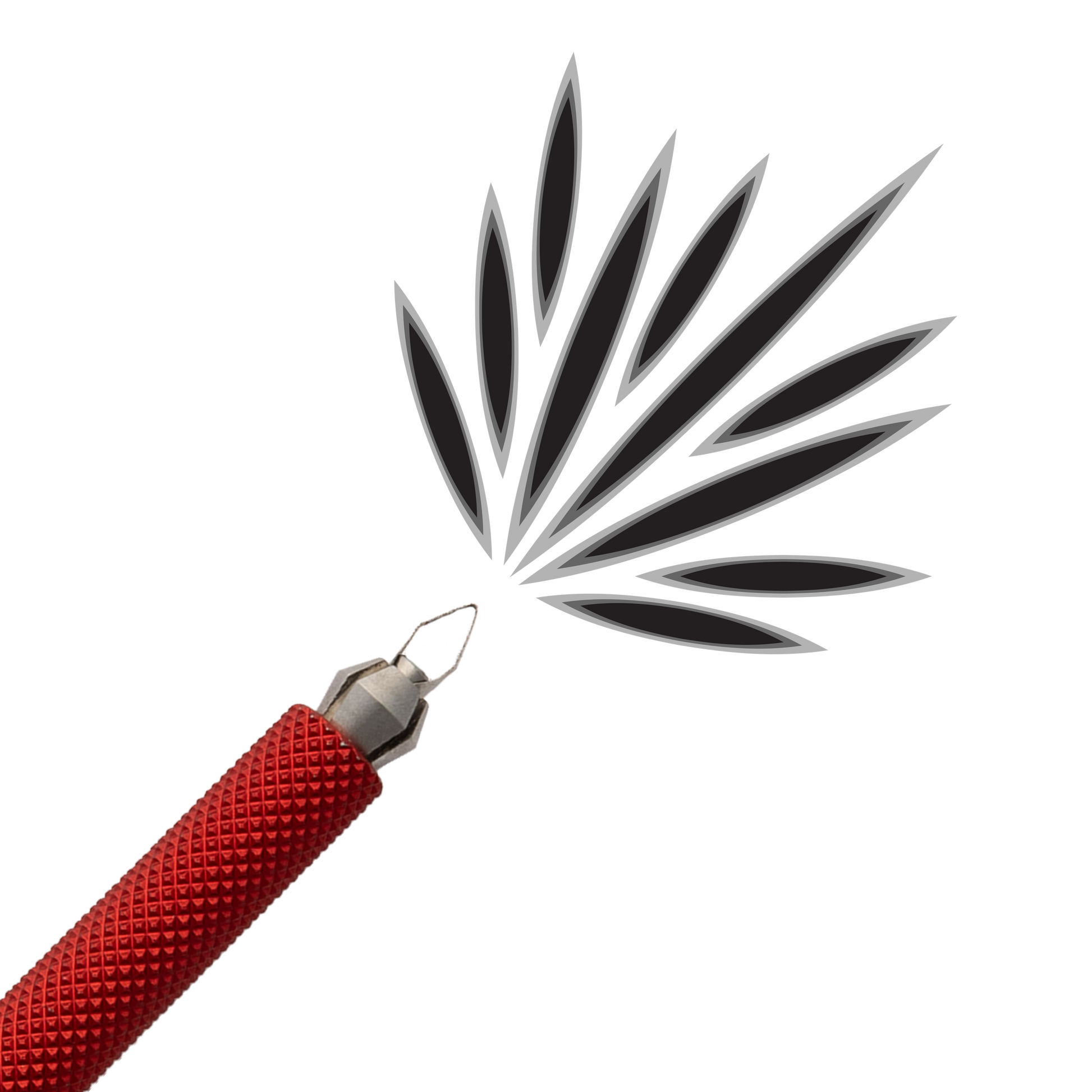 The small pointed blade is ideal for outlining and most detailed sgraffito work. It has a ~1 mm pointed tip that tapers outward at a 45° angle, allowing for varied stroke widths depending on the depth of your cut. When tilted, the side of the blade can also be used to clear or remove a larger surface area.