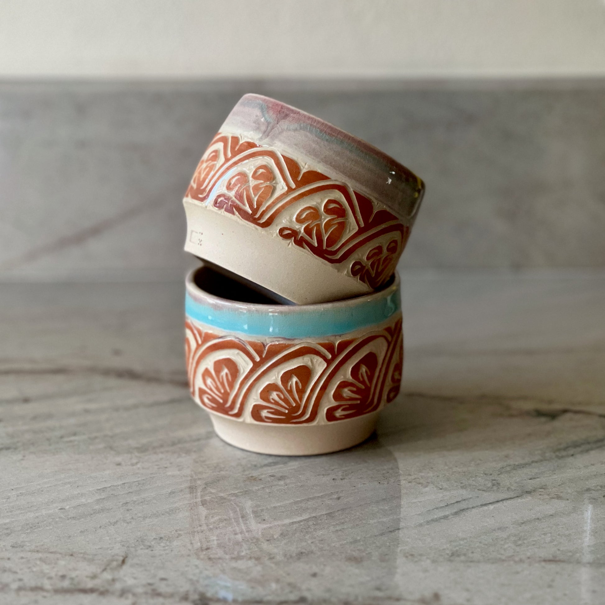 These two little cups come as a pair. Perfect sippers, great for a gift. White clay with a terracotta sgraffito carving around the outside.