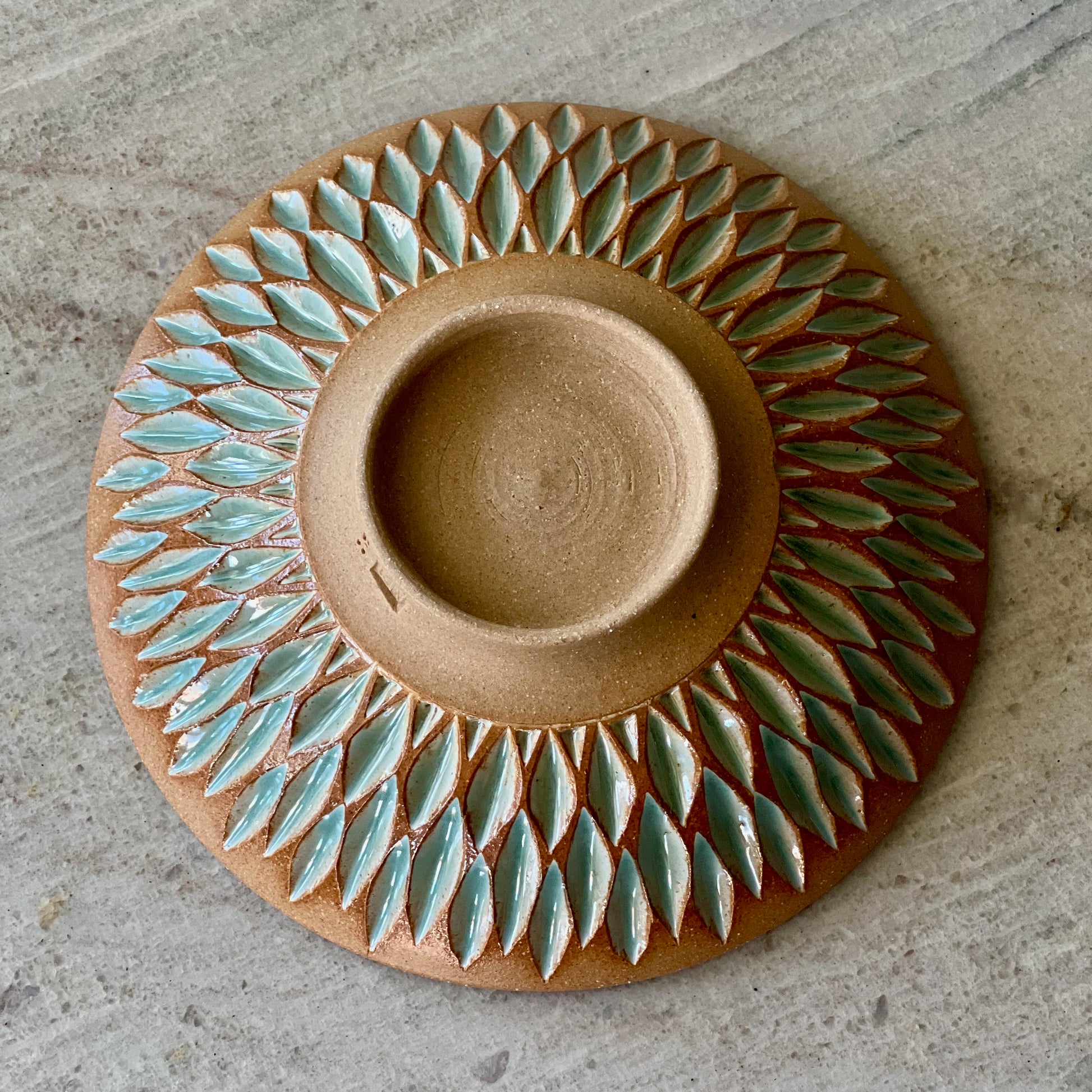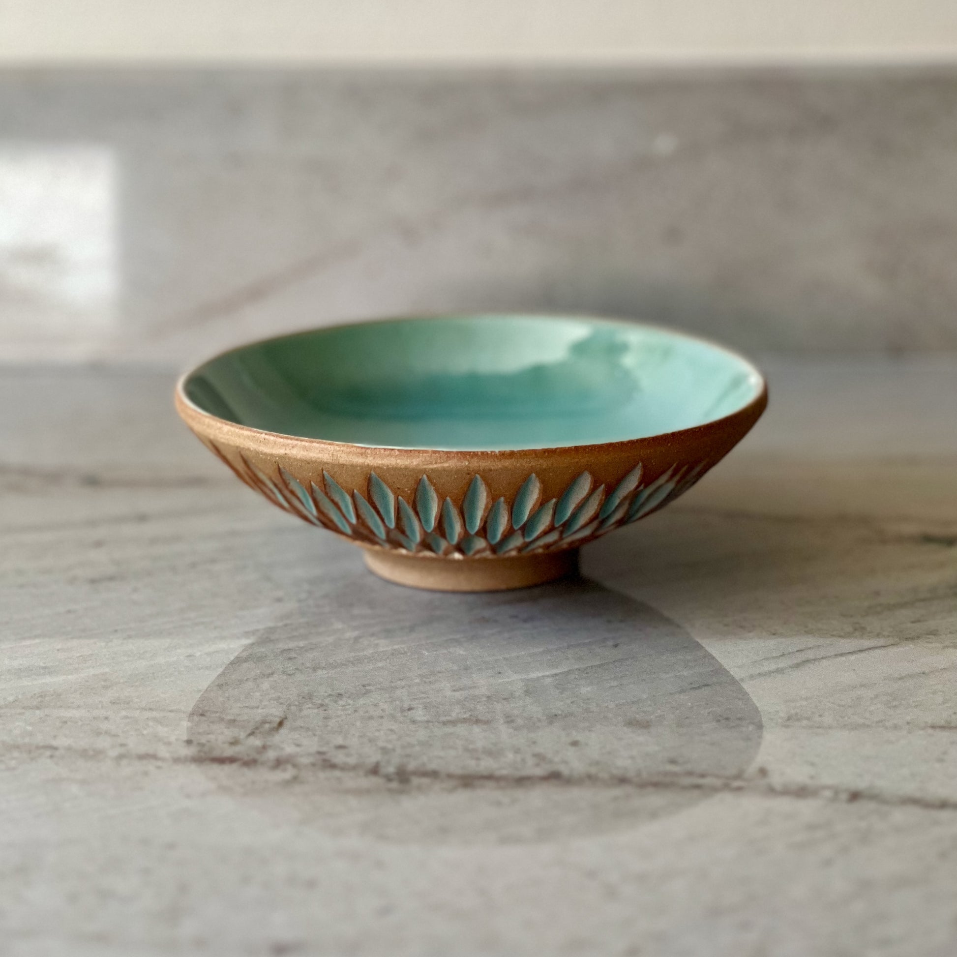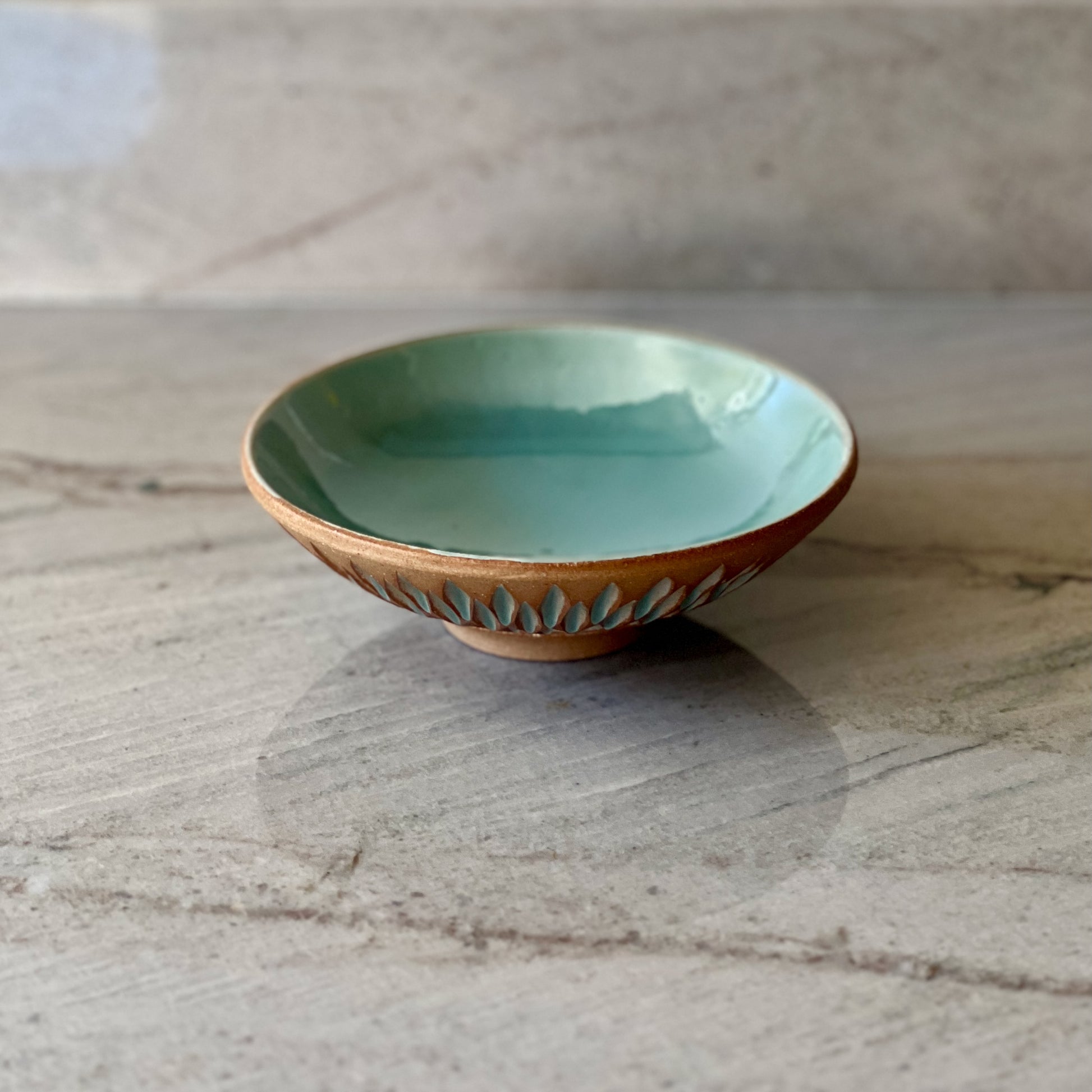 A small low bowl perfect for table settings or a catch all. Made form ann earthy light brown clay body with a blue/green smooth glaze. The outisde has a thin diamond shaped carving pattern with the glaze filling each slot.