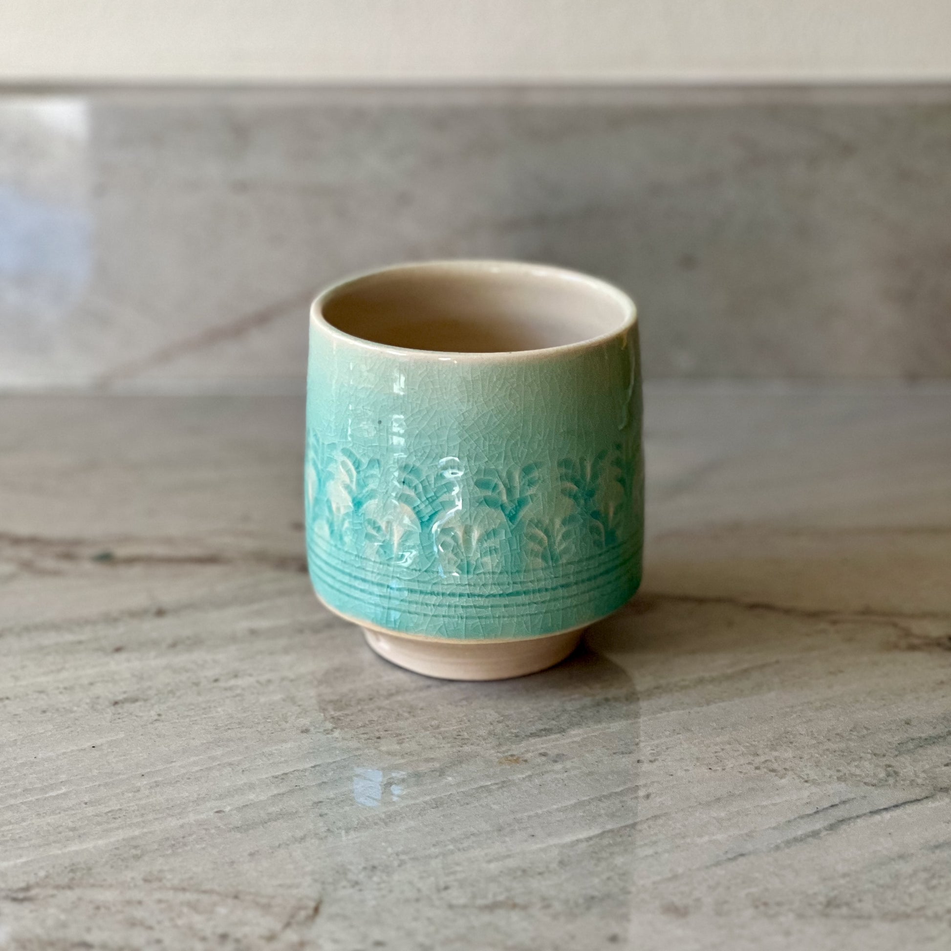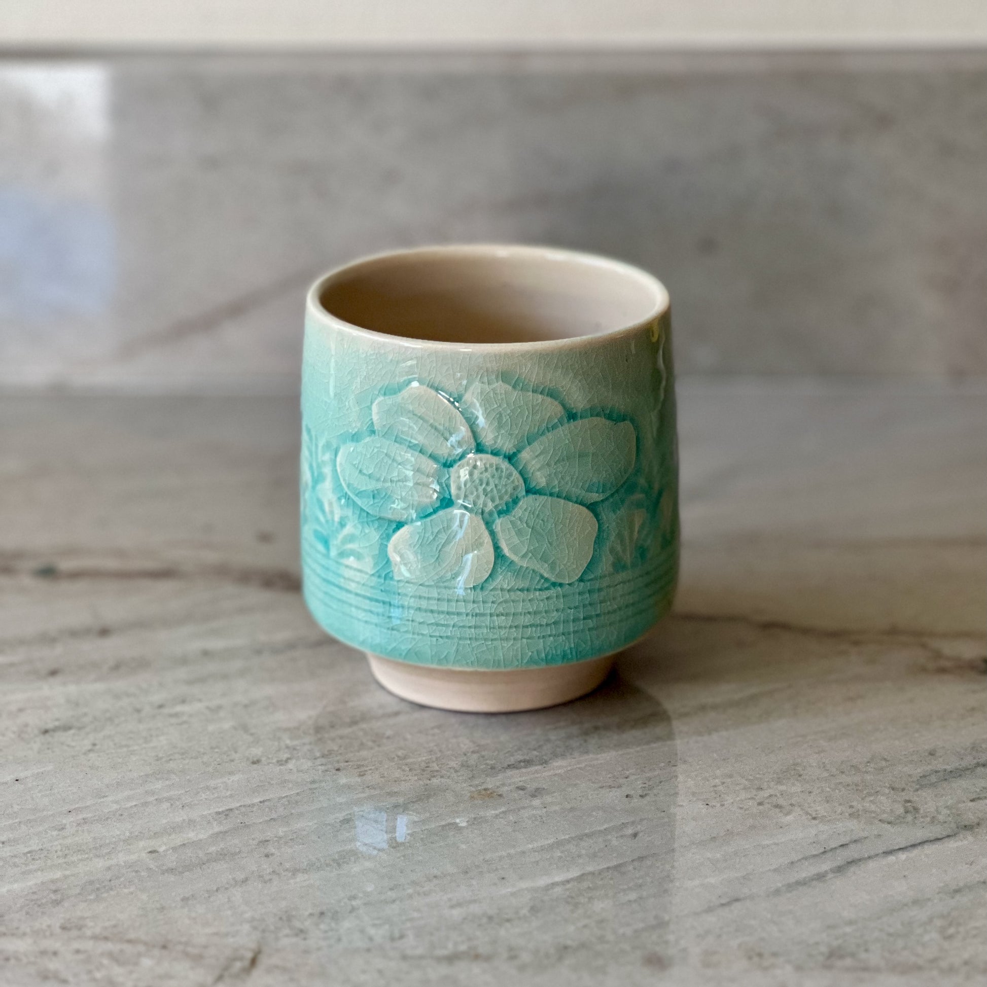 A medium white clay cup with a simple relief carving pattern around the outside and a single relief style flower. Cool to look at, cool to hold. Perfect for any beverage.